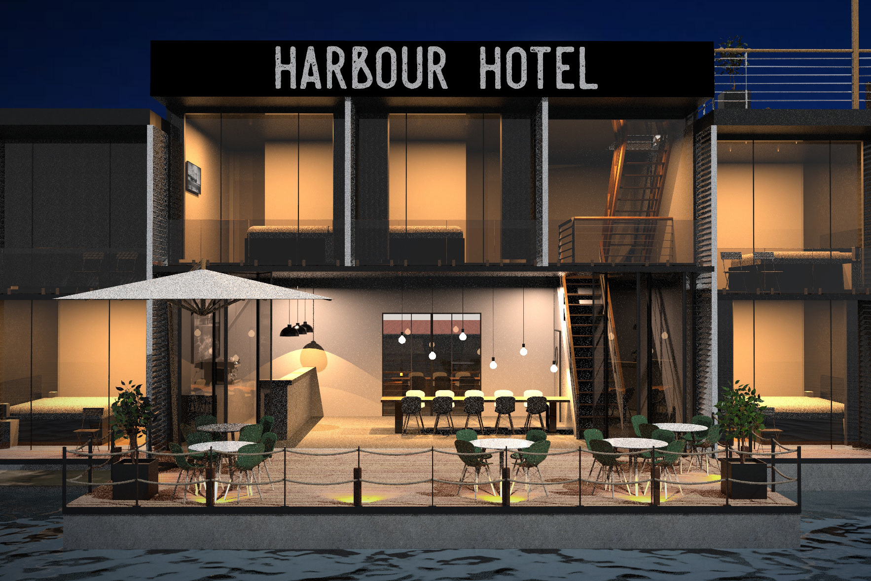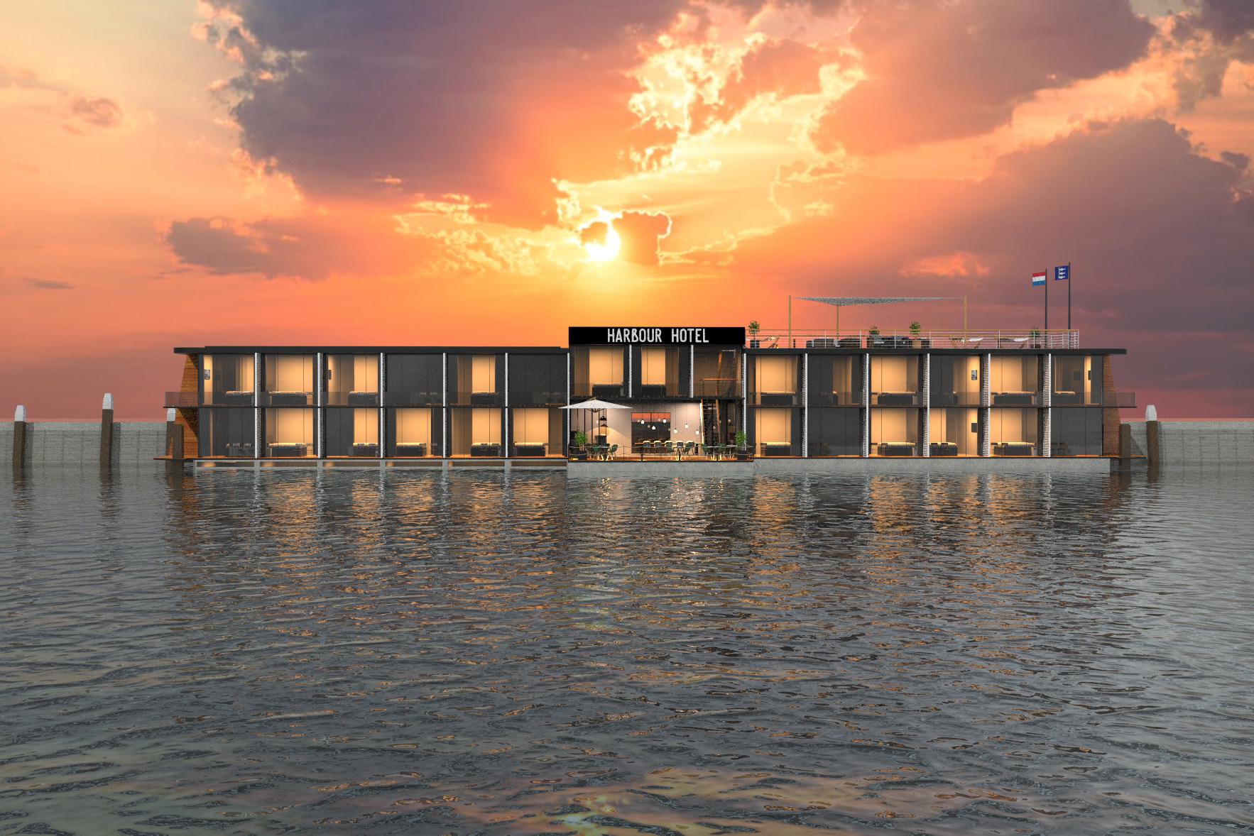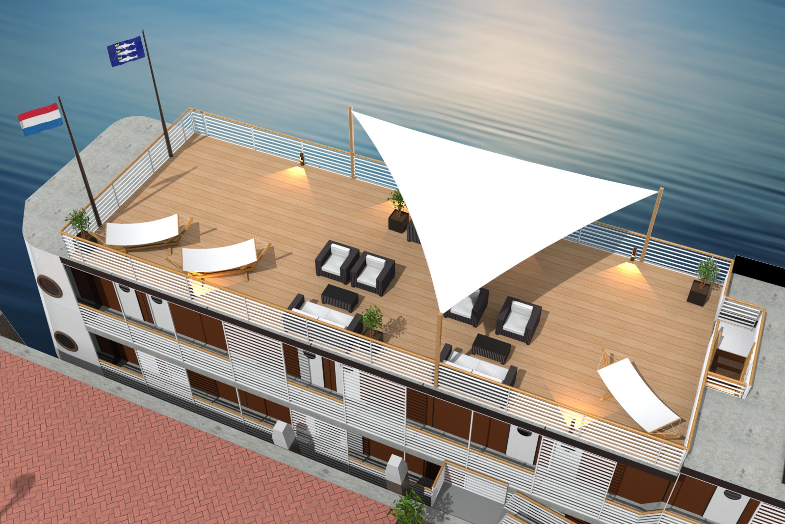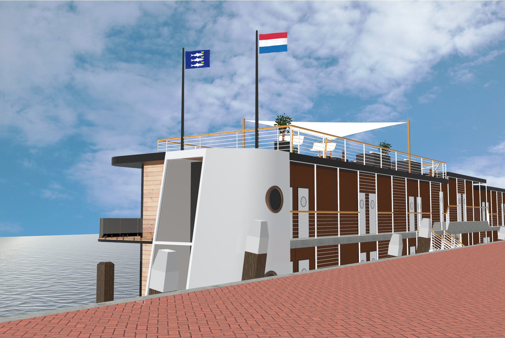 Floating hotel concept on behalf of Jeroen Duijkers. 3D model made to measures | Renders| Image editing | Brochure design
